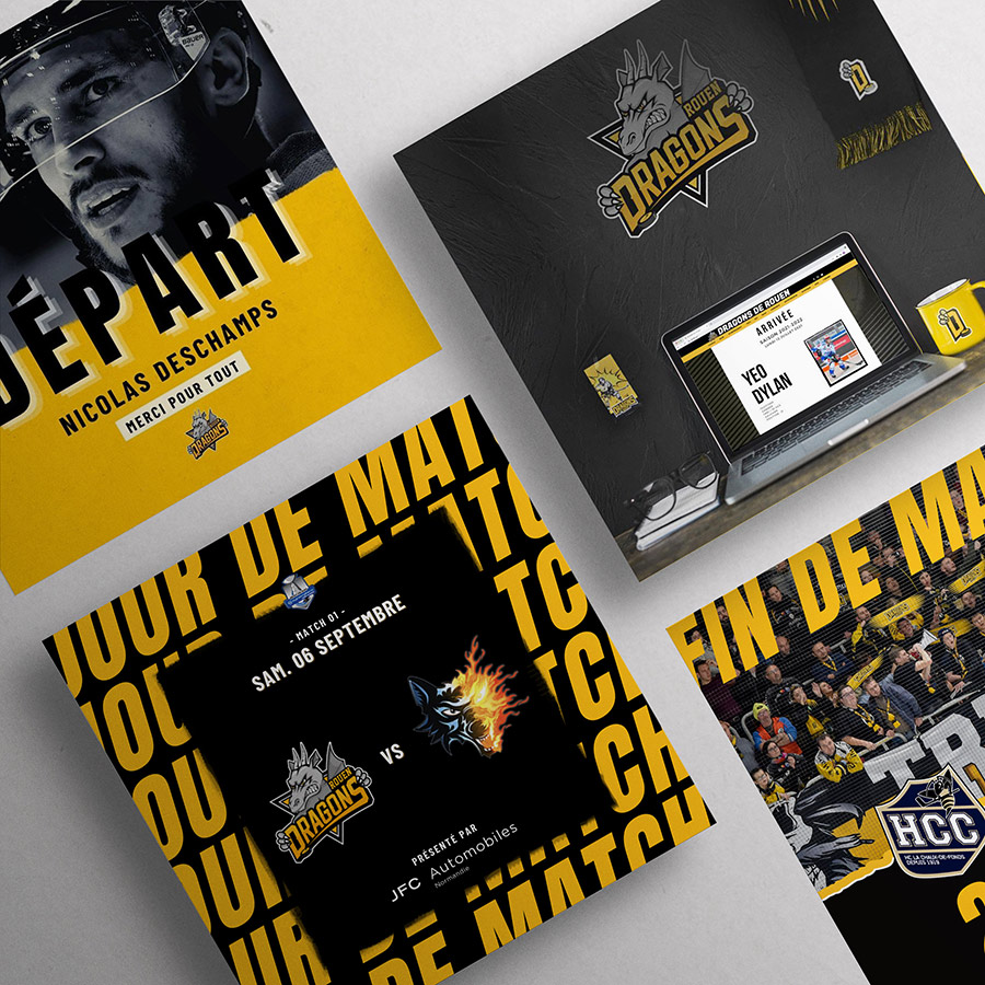 Créations graphiques pour les Dragons de Rouen sur la saison depuis 2019.